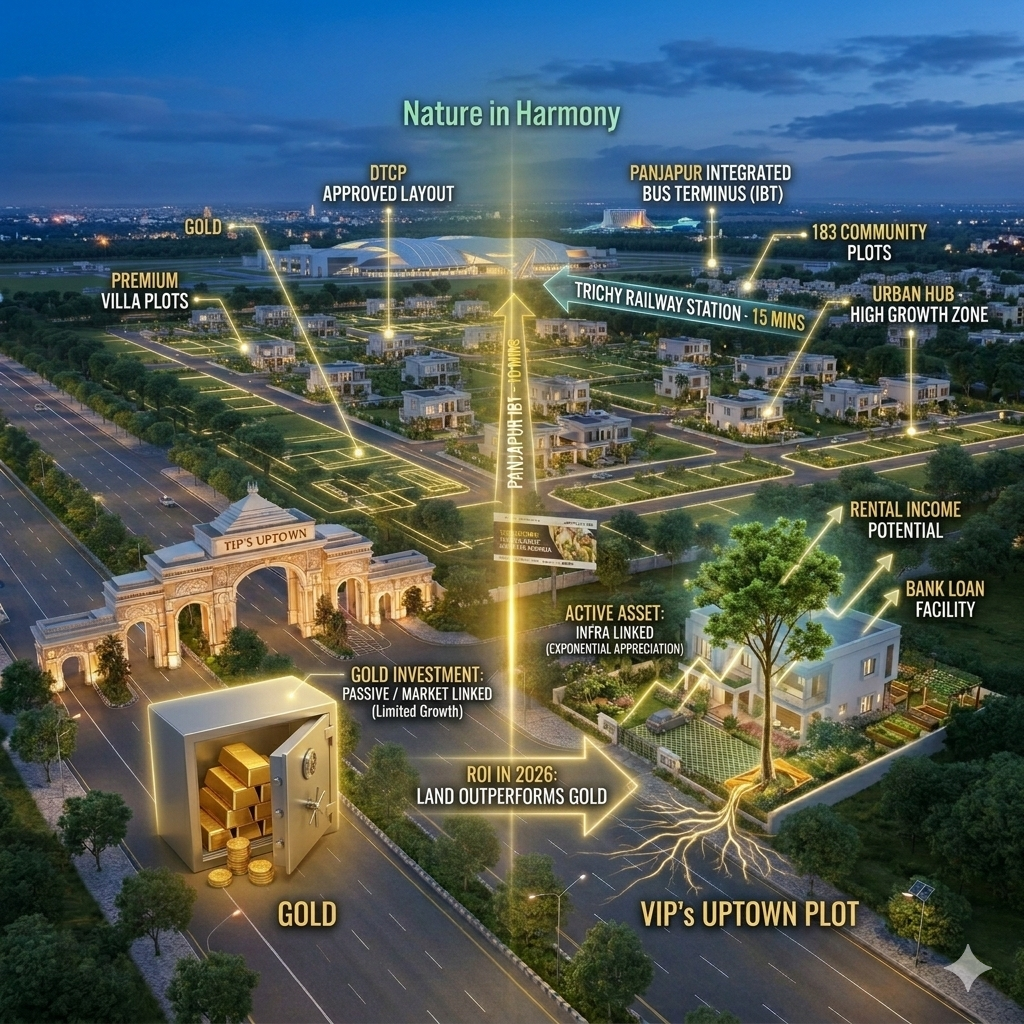 For generations, the Indian investment narrative was dominated by a single yellow metal: Gold. However, as we move through 2026, a significant shift is occurring in the financial landscape of Central Tamil Nadu. Savvy investors are realizing that while gold preserves wealth, premium villa plots at Uptown Trichy create it. In the battle of assets, land—specifically in high-growth corridors like the Uptown Trichy to Dindigul highways—is outperforming traditional hedges by a wide margin.